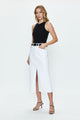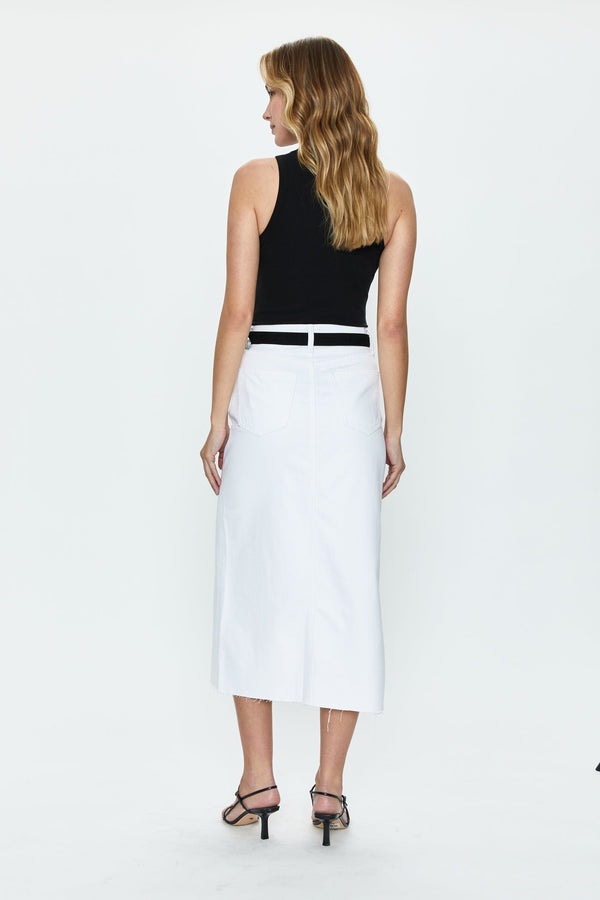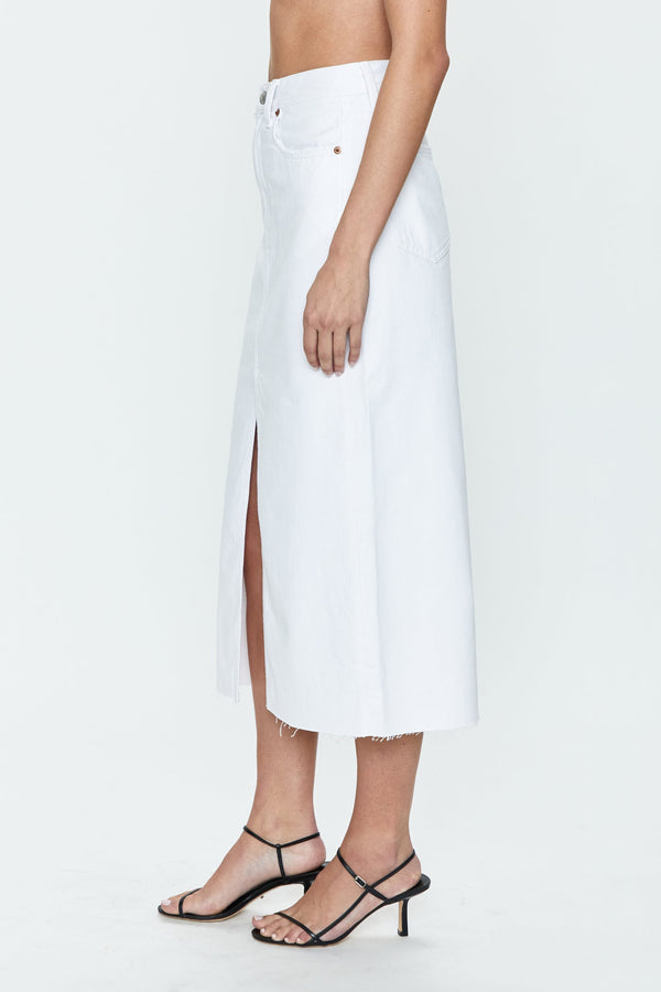 The Alice Midi Skirt in white denim by Pistola is a versatile staple for your wardrobe. The Alice features a stylish midi length and front slit that will look amazing with any top. Frayed hem.