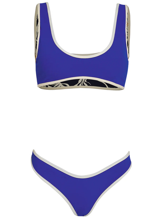 The Jilly Sporty Bralette Bikini Top in Cobalt Blue is your new go-to for versatile beach vibes. This 4-way piece lets you switch up your style—wear it inside out or flip the front to the back for fresh looks. With fixed wide straps, moderate coverage, and removable soft cups, it balances sporty comfort with a flirty edge. The piping detail and guaranteed reversible print add extra charm.