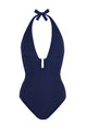 Make a splash in the Navy U-Bar Halterneck Swimsuit by Heidi Klein! This suit features a ruched under-bust panel that flatters while you frolic in the waves. Customize your comfort with adjustable neck ties and removable padding. Responsible honeycomb fabric hugs your curves just right, while medium coverage keeps things fun.