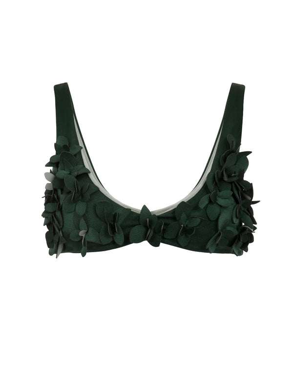 The Top Aulea in Green by Ancora is a playful triangle top that's anything but ordinary. Hand-sewn laminated floral decorations add a touch of artisanal charm, while laser-cut precision ensures every detail is perfectly placed. The adjustable back means you'll find your ideal fit every time. Whether you're lounging poolside or catching waves, this top brings personality and comfort together in one gorgeous package.