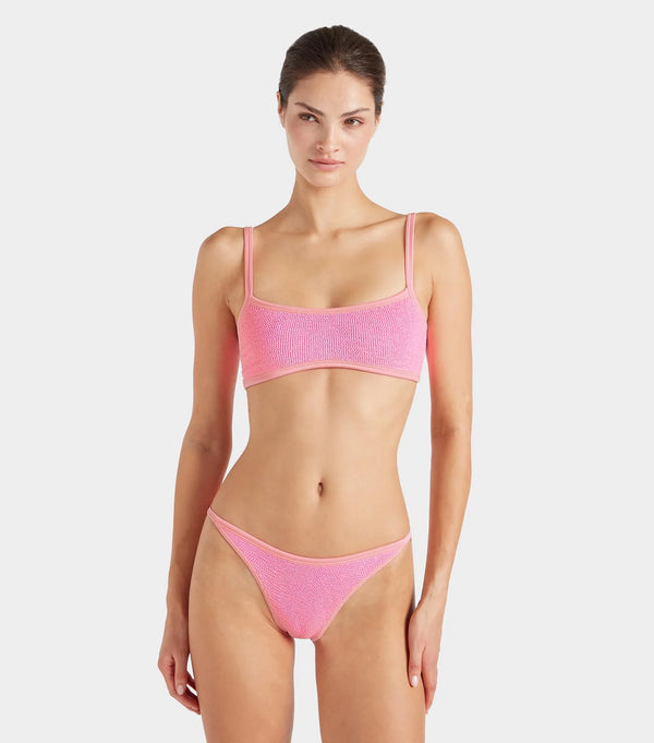 Get ready to make a splash with the Tyler Bikini in Tonal Bubblegum by Hunza G. Combining sleek, sporty 90s style with tonal lycra detailing, this bikini is both stylish and comfortable. Featuring tanga briefs for a skimpy coverage, it's your new elevated essential for the beach or pool.