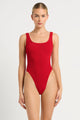 Transform into the ultimate beach babe with the Madison One Piece in Baywatch Red Eco by Bond-Eye. This one piece offers full coverage with a conservative scoop neck and wide shoulder straps for support. Perfect for any bust size, it can be worn low, mid or high on the hip for a customizable fit. Baywatch vibes included!