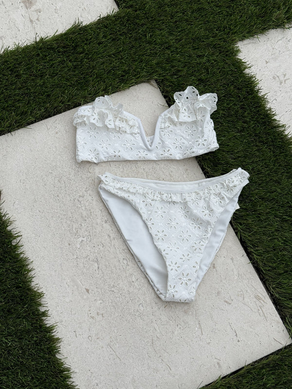 The Sloane Bottom features delicate eyelet ruffle trim that adds a playful, feminine touch to your swimwear collection. Crafted in crisp white broderie anglaise, this bikini bottom combines classic elegance with modern style. The intricate eyelet detailing and ruffled edges create movement and visual interest, while the quality construction ensures a comfortable fit for all-day wear. Perfect for beach days or poolside lounging, this piece pairs beautifully with any bikini top for a coordinated look.