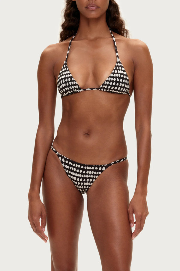 Textured String Brief by Zulu & Zephyr in Spot. Go minimal, go bold, go you. This playful bikini brief features custom jacquard-knit fabric with organically shaped spots that make a subtle statement. The dyed-to-match lining keeps everything sleek and seamless, while adjustable fixed string sides give you total control—wear it slung low for effortless cool or pulled high for confident edge.
