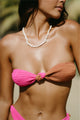 The Bahamas kini top is a bandeau style featuring a flattering knot in the center of bust. A delicate gold clasp is provided for the a seamless fit in the back. Ophelia offers the Cleonie Bahamas top in the Barbie and Espresso colors.