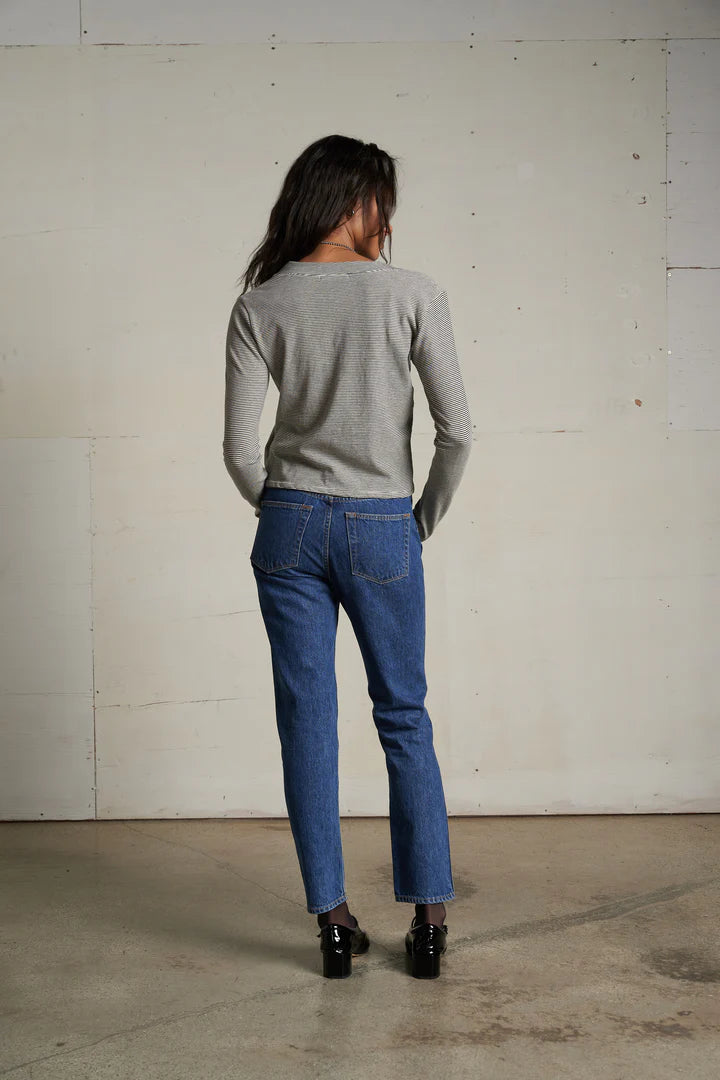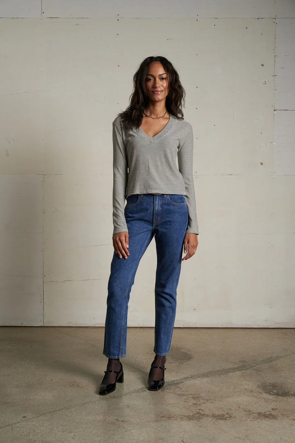 Tuckable and cozy, this Fiona Stripe Recycled Cotton V Neck Tee in Ivory Black Stripes by Perfect White Tee is a lightly fitted tee is your go-to layering piece for sweater season. Crafted from recycled cotton, the classic ivory and black stripe adds effortless style to any outfit. Perfect for tucking in or wearing loose—versatility never looked so good.