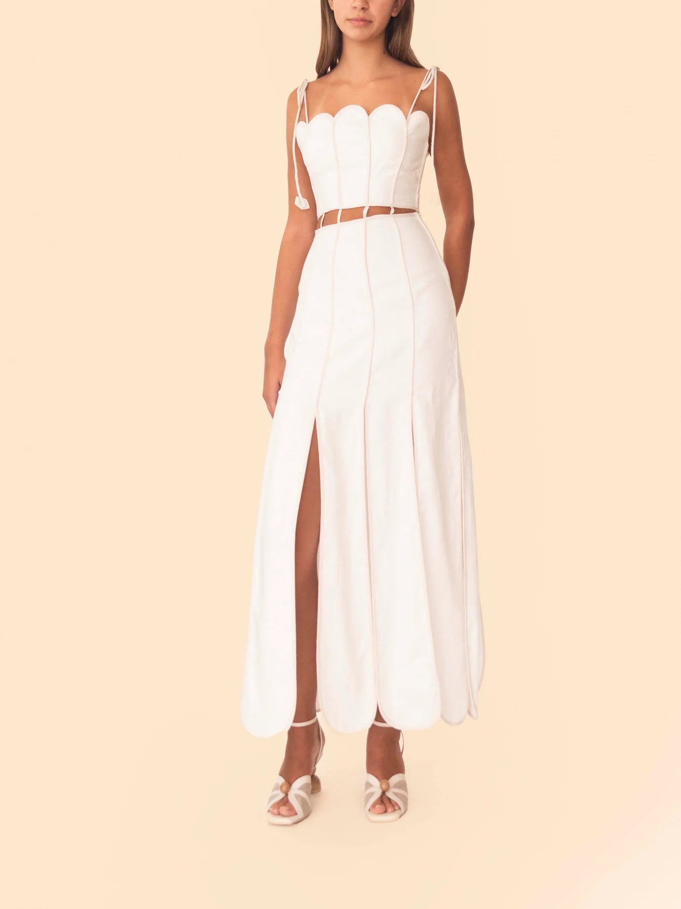The Malta Dress in Ivory by Azulu is your new go-to for effortless elegance. This minimalist beauty features a delicate scalloped bodice that frames the shoulders just right, paired with dainty ties that let you adjust the fit to perfection. The flowing skirt showcases chic paneled openings for movement and a hint of playful flair. Timeless enough for any occasion, yet modern enough to feel fresh season after season.