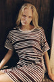 This playful mini dress by Zulu & Zephyr brings cozy comfort with its soft ramie-cotton blend and a fun custom chocolate stripe design. The relaxed fit, classic crew neck, and drop shoulders keep it casual, while the side waist cut-out with an adjustable drawcord lets you tailor the fit just how you like it. Perfect for effortless style with a flirty twist!