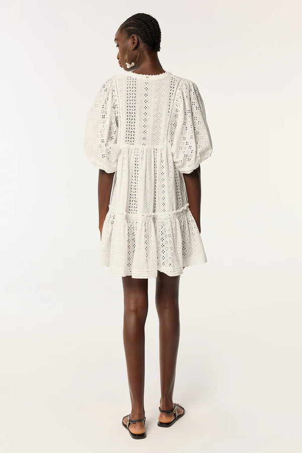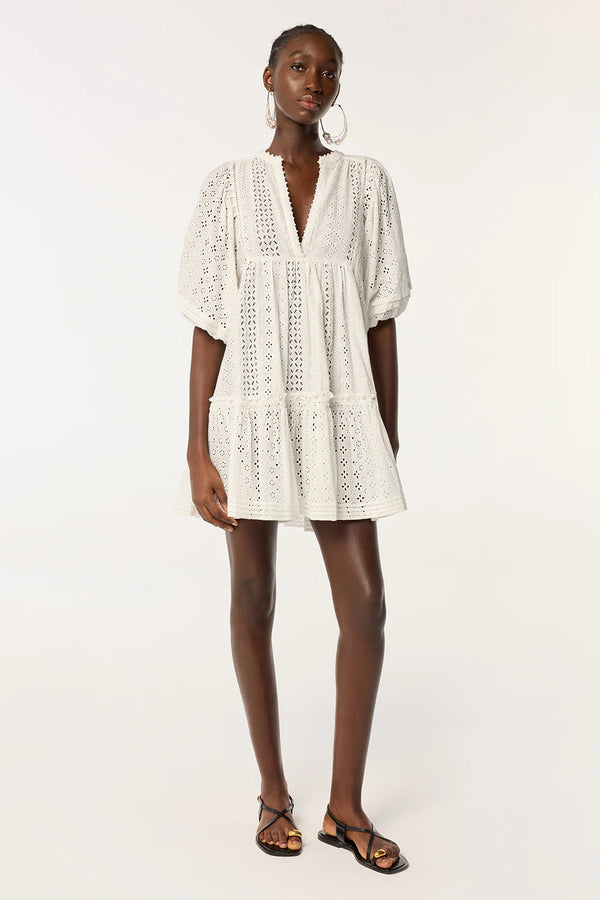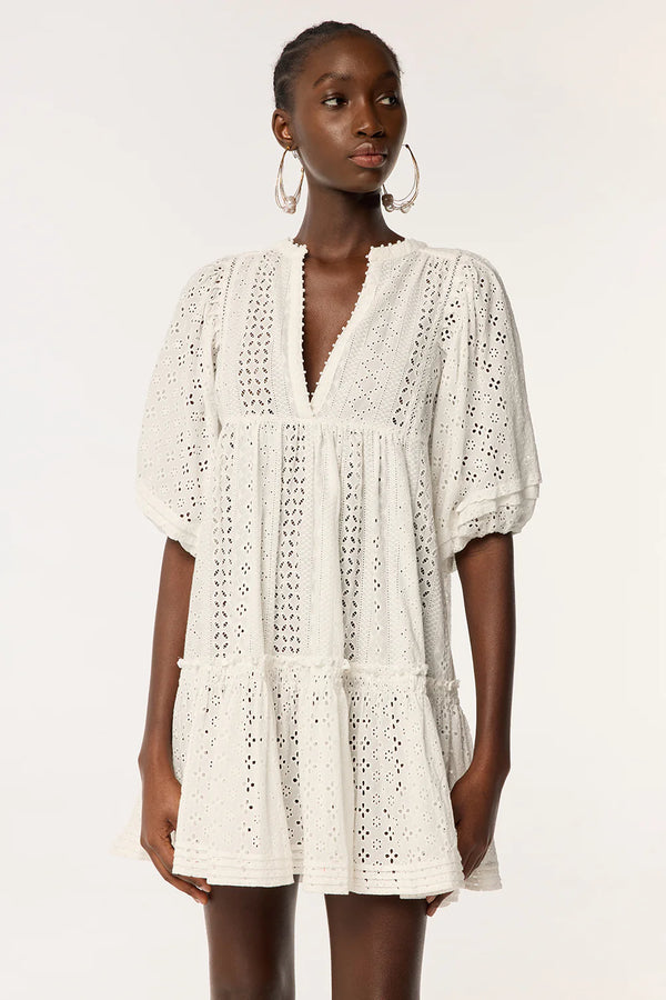 Introducing the Aria Mini Dress by Poupette St Barth in Natural White! This darling shirt-inspired trapeze dress features a charming silhouette with a Tunisian collar and textured neckline. The cotton eyelet lace and ¾ balloon sleeves add a playful touch, resulting in an elegant look with delicate pleats and folds.