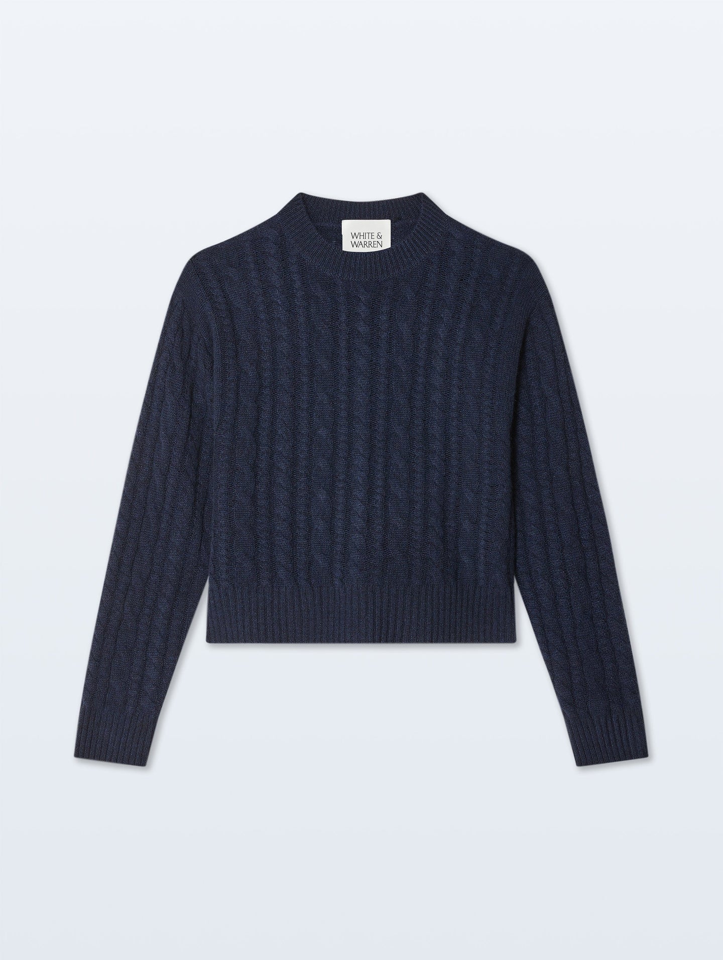 Elevate your basics with this cashmere cable crewneck in deep navy by White and Warren that proves classics never go out of style—just better. Spun from impossibly soft, featherweight cashmere, it features a cropped, relaxed silhouette that skims the body just right.