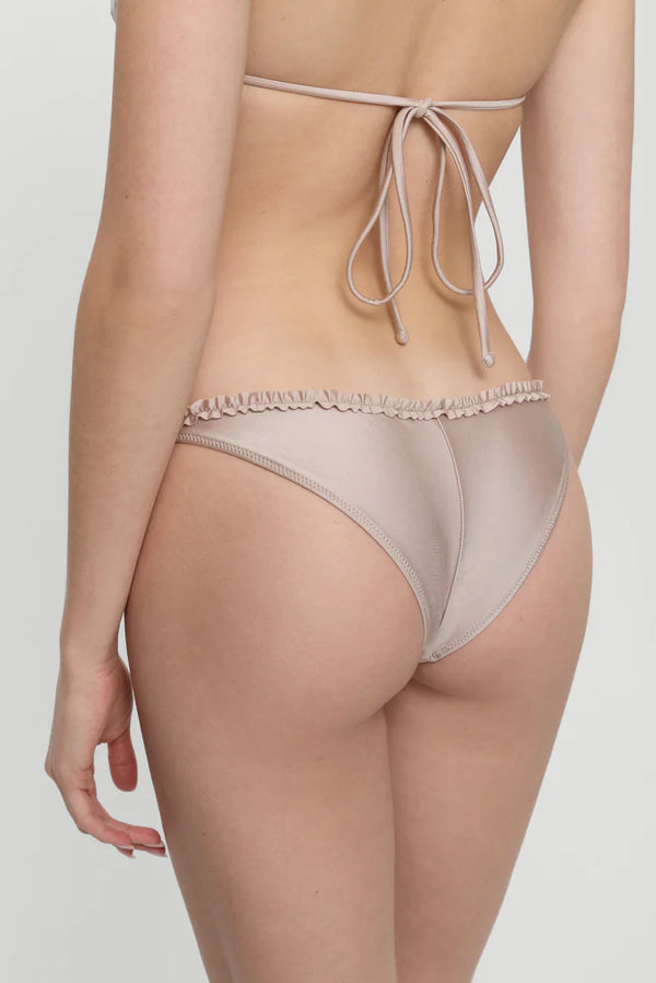 The Kate Cheeky Shine Bikini Bottom by Frankies Bikinis in Birthday Suit delivers playful confidence with its cheeky coverage and flattering mid-rise fit. Delicate ruffle trim adds feminine charm while the glistening satin shine fabrication catches light with every move. Perfect for making a statement at the beach or pool.