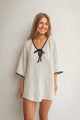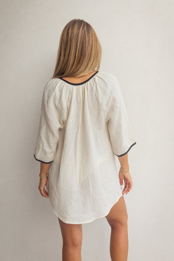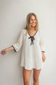 Unleash your inner boho goddess with our Contrast Binding Cover Up Dress in Cream! Crafted by our label, Ophelia Love, this tunic exudes a playful vibe with its contrast binding and quirky tie around the neckline. Perfect as a coverup or paired with mini shorts for a trendy tunic look. Effortlessly chic (and versatile)!