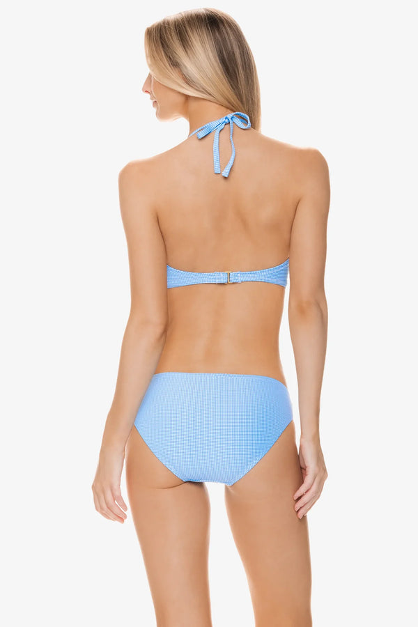 Enjoy playful charm with the Tortoise Hipster bottoms in Peri Gingham by Helen Jon. Fully lined for comfort and moderate coverage, they feature classic faux-tortoise details on the sides that add a stylish twist to your swim look. Perfect for mixing fun patterns with timeless accents!