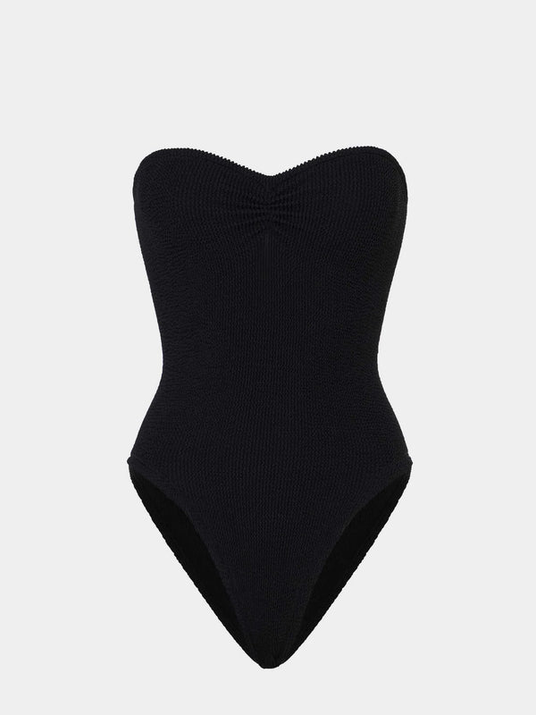 The Brooke Swim in Black by Hunza G combines understated elegance with flattering design. This one-piece features a ruched sweetheart neckline that adds dimension and visual interest, while the sculpted silhouette provides gentle shaping and support. The classic cut bottom offers timeless style that works for any occasion—whether you're lounging poolside or making a splash. One size fit ensures effortless comfort and confidence in the water.