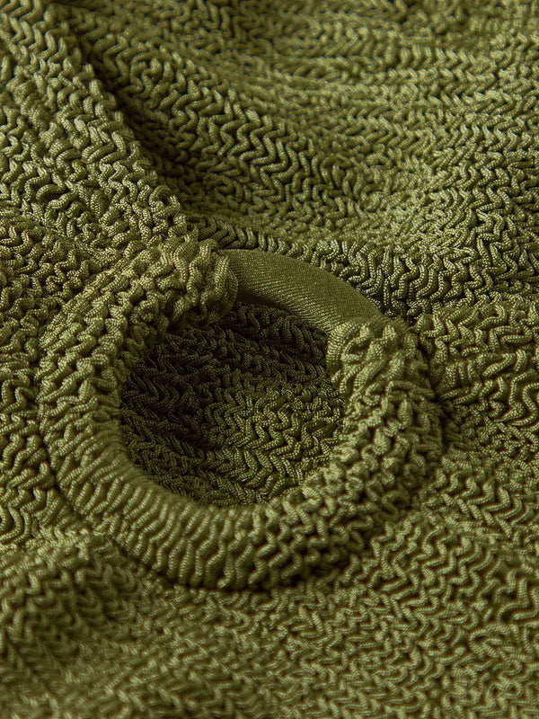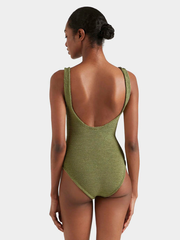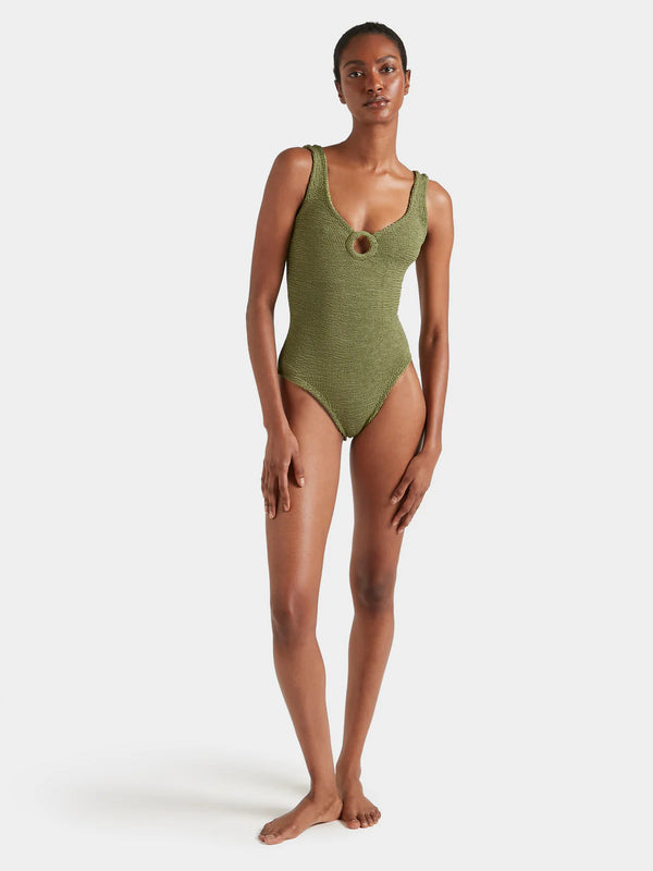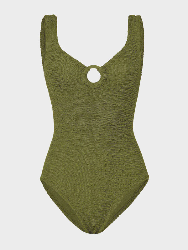 The Celine by Hunza G in Metallic Moss gets an upgrade with enhanced bust support and increased body coverage for a secure, flattering fit. Featuring a lower leg line and adjustable design, this style delivers the coverage you want without compromising on Hunza G's signature elegance. Tonal hoops add subtle dimension to the metallic moss colorway, creating a refined look that works beautifully both in and out of the water.