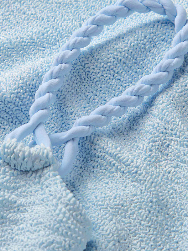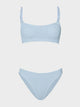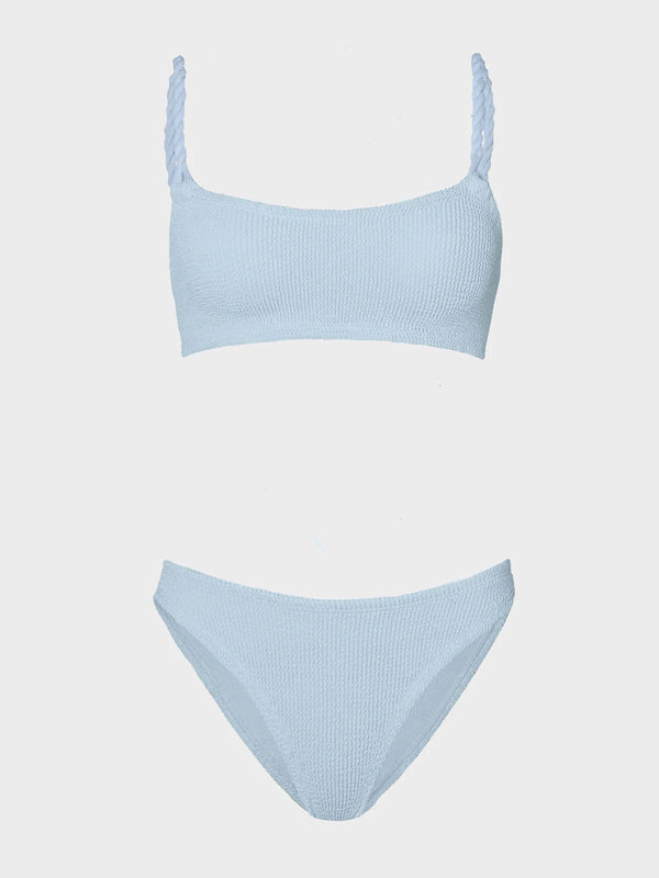 Elevate your swimwear collection with the Phoebe Underband Bikini in Metallic Ice Blue by Hunza G. This sophisticated two-piece features signature twisted strap detailing that adds visual interest while maintaining timeless appeal. The top showcases tonal twisted straps for a modern, dimensional look, while the classic medium coverage briefs offer comfort and flattering support. The cool metallic ice blue tone works beautifully with neutrals and complementary swimwear pieces. Hunza G is sold as a set, with a one size fit.