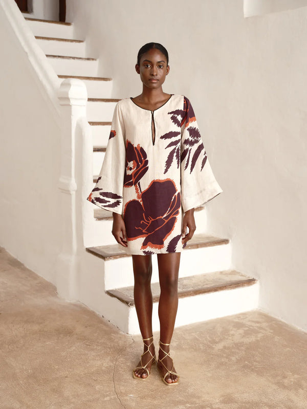 Nazare Linen Mini Tunic Dress Ecru Purple Gladiolos