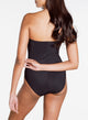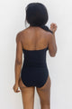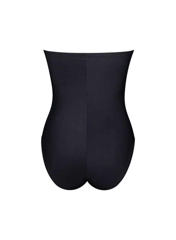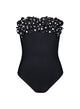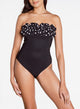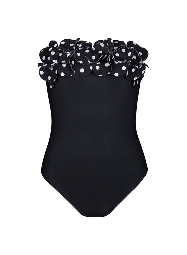 This playful bandeau swimsuit by Karla Colletto features a charming swathe of floral appliqués crafted from retro-inspired polka dot fabric. The black and white design adds a timeless touch to this effortless one-piece, making it perfect for those who want to stand out with a fun, vintage flair at the beach or pool.