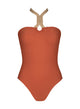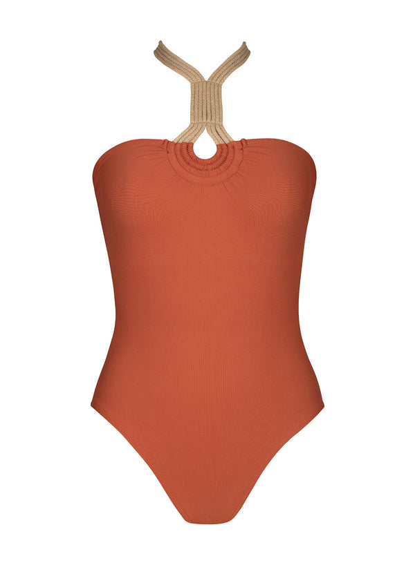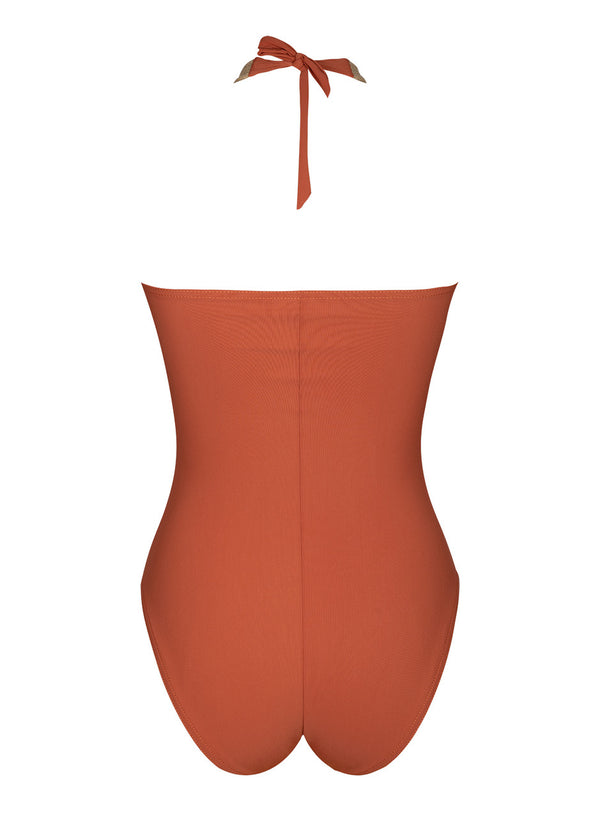 The Charlie one piece swimsuit by Karla Colletto features a sculptural band of cotton rope that winds up and around the neck. This classic bandeau style swimsuit provides full rear coverage.