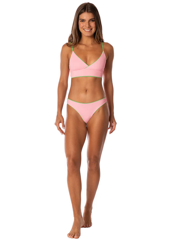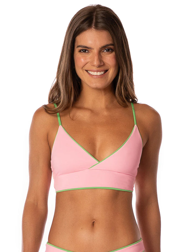 This Criss Cross Long Line Triangle Bikini Top in Emerald Brocade by Maaji is a sporty bralette features a stylish criss-cross design with a lace-up back for an adjustable, flattering fit. Reversible to a vibrant pink, it lets you switch up your look effortlessly while enjoying long line support for comfort and confidence in every move.