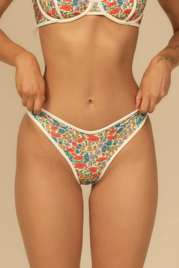 Dive into the Lulu with confidence! This mid-rise bikini bottom by Montce delivers full coverage where it counts, featuring a flattering high-cut design that elongates your legs beautifully. The vibrant floral print is perfectly balanced with crisp cream binding for a fresh, polished look. Whether you're lounging poolside or catching waves, you'll feel supported and stylish in this playful essential.