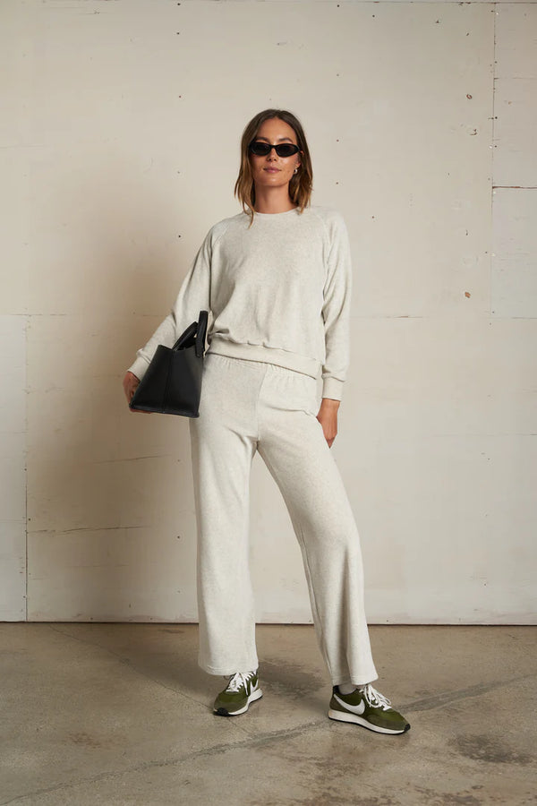 Wrap yourself in holiday luxury with the Alex Velour Pull On Sweatpant in Oatmeal by Perfect White Tee. Crafted from sumptuous soft plush velour, these pants are your new seasonal essential. The effortless pull-on elastic waistband means zero fuss—just slip them on and feel instantly cozy. With a sleek, pocket-free silhouette, they strike the perfect balance between laid-back comfort and polished sophistication.