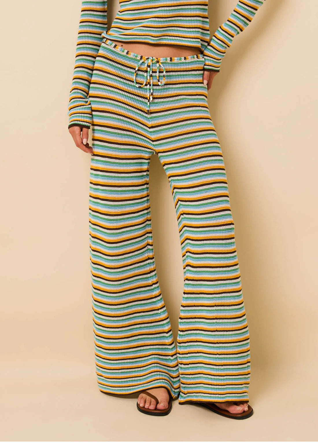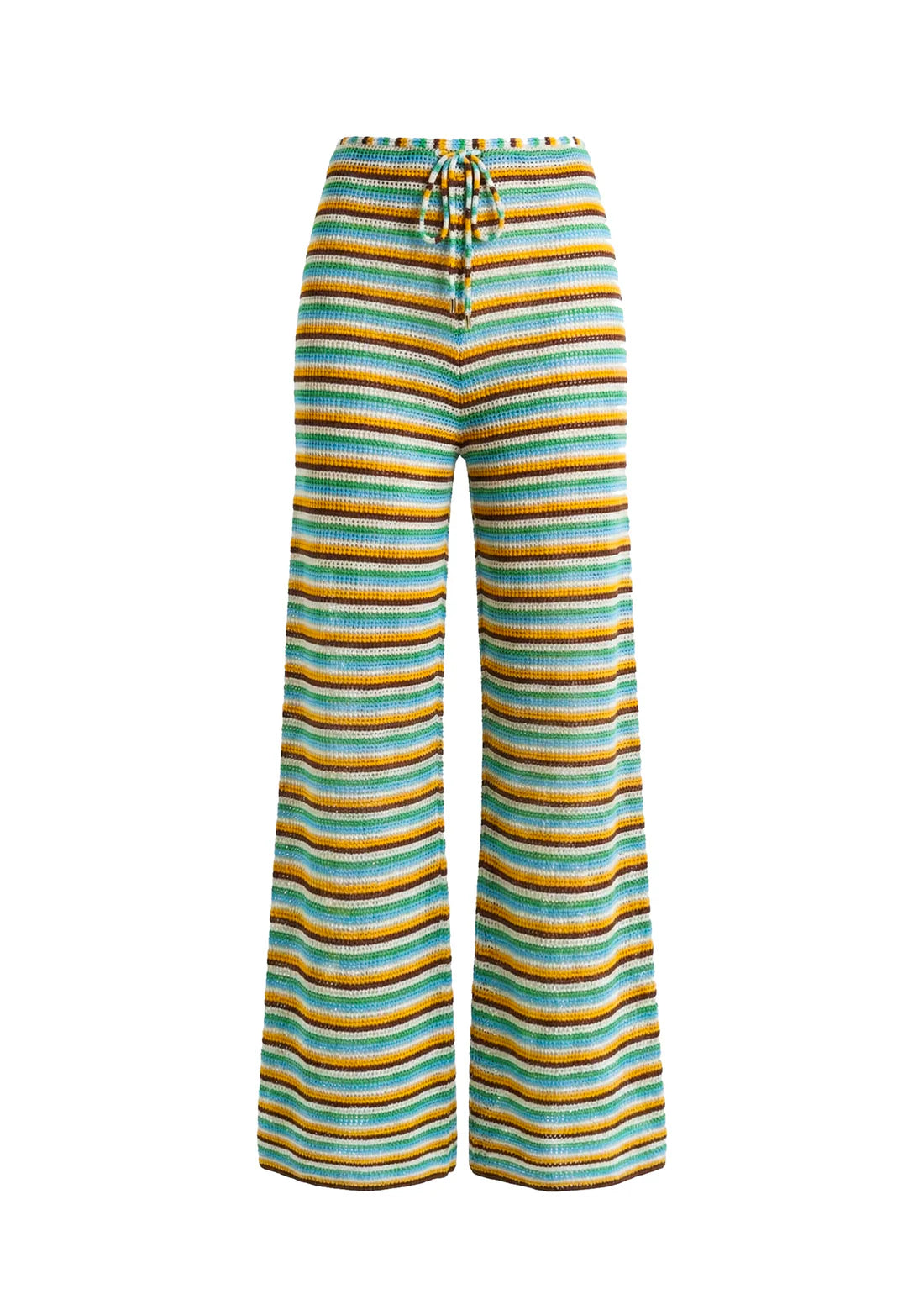 Effortless beach style meets comfort in the Ayden Pant by Solid & Striped. Crafted from an open cotton knit, this cover-up pant drapes beautifully with a relaxed, flared silhouette. The mid-rise pull-on design features a drawstring waist for an adjustable fit, making it perfect for layering over your swimsuit or wearing solo. The St. Barths multicolor stripe adds a vibrant, vacation-ready touch to your resort wardrobe.