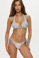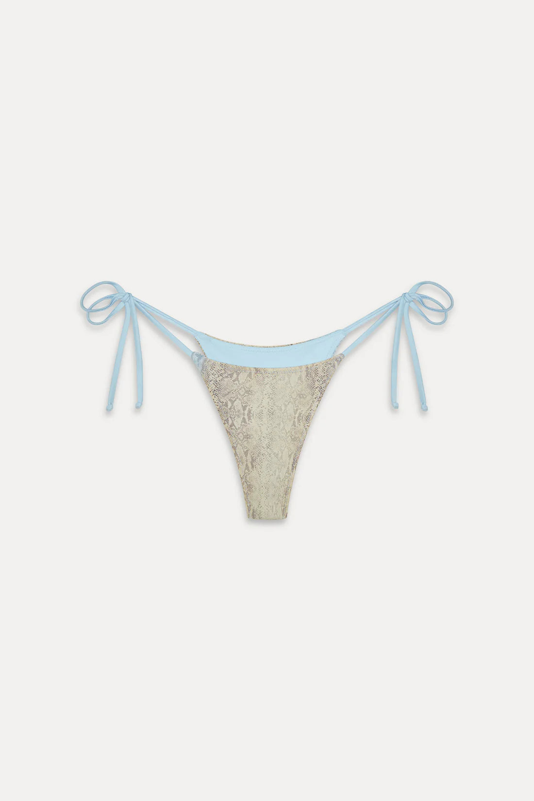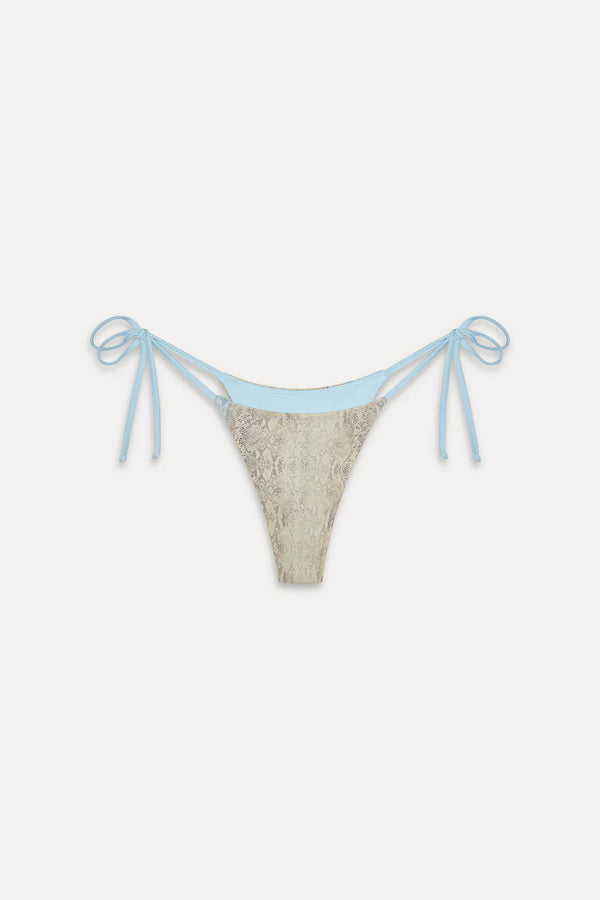 Rock a bold look with this sassy bikini bottom that flaunts a low-rise silhouette and customizable string side ties for your ideal fit. The eye-catching Blue Python animal print shines on silky satin fabric that glides smoothly against your skin. Perfect for those who dare to stand out, this cheeky piece combines edgy style with comfort for unforgettable beach moments.