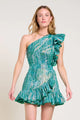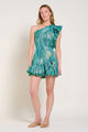 The Corrine mini dress by Poupette St Barth in Green Akoya brings effortless elegance in shimmering cotton metallic. This one-shoulder stunner features a ruffled sleeve, crossover skirt, and playful zigzag lace trim. A smocked back waist and fabric-covered button details complete the look—perfect for turning heads!