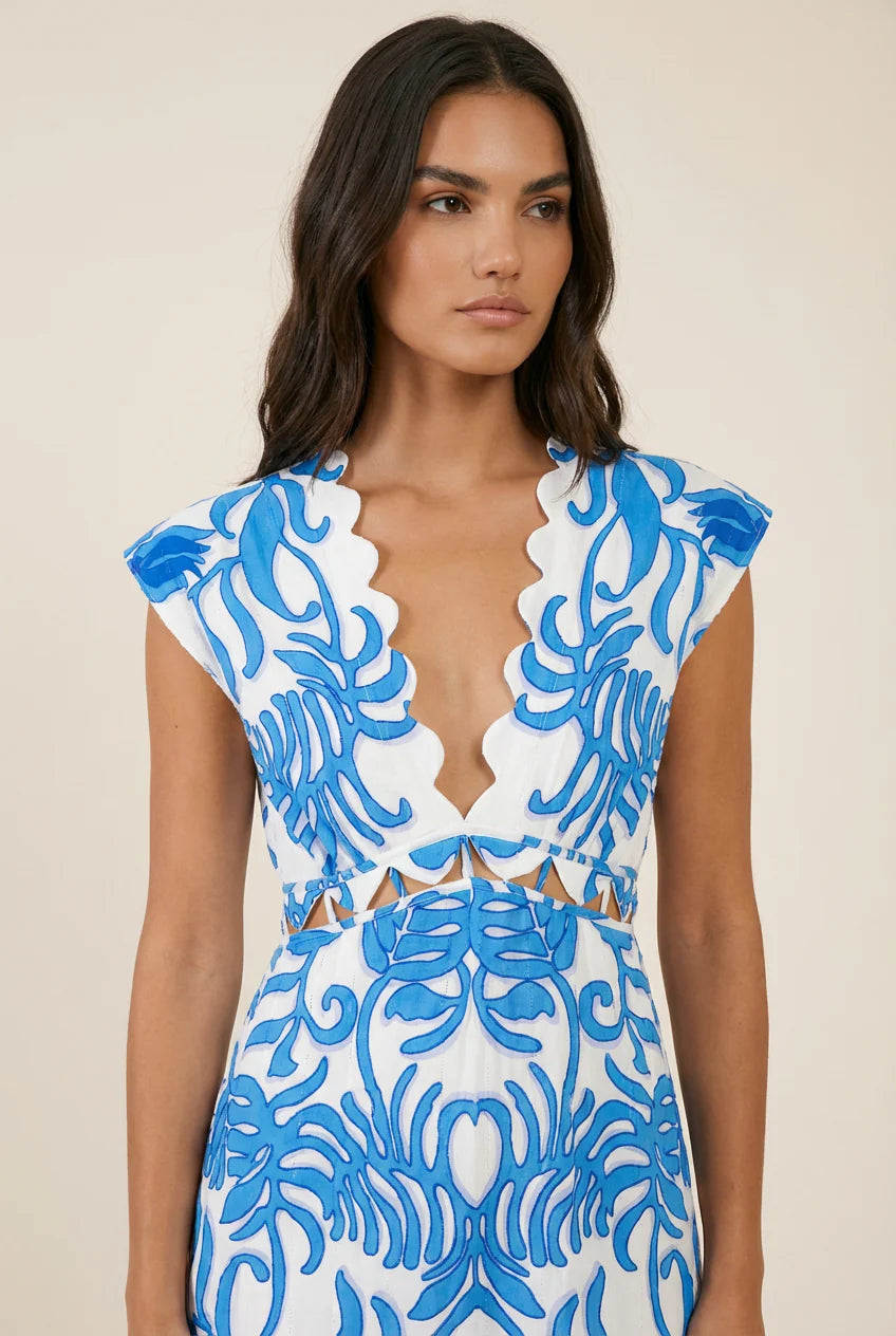 Elevate your wardrobe with this sophisticated Hazel Mini Dress by Poupette St Barth featuring delicate scallop detailing along the neckline and waistband for a refined, feminine touch. The invisible back zip with covered button ensures a seamless silhouette, while functional side pockets add everyday practicality. In placement print, White Blue Ritual, this dress is perfect for transitioning from day to evening.