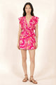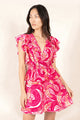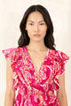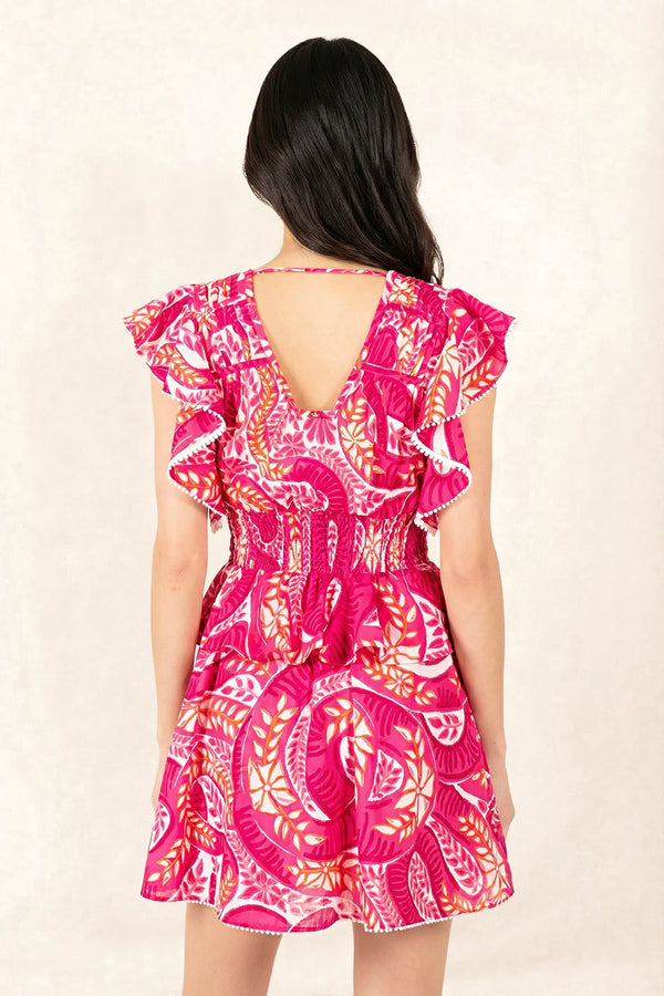Introducing the Mini Dress Noemi in Pink Holy Snake by Poupette St Barth. This dress features architectural pleating across the shoulders that creates dimension and movement. Short ruffled sleeves finished with delicate rounded lace add a romantic touch, while the deep V-neckline is secured with a hidden metal hook-and-eye closure for a seamless look. The front waist showcases heavy gathered detailing with an inserted elastic cord for a flattering, defined silhouette. A supportive strap at the back neckline ensures comfort and stability. The smocked back waist provides structure and visual interest from every angle. The peplum-style tiered skirt creates a playful, flared hem, finished with lace trimming that echoes the sleeve details.