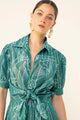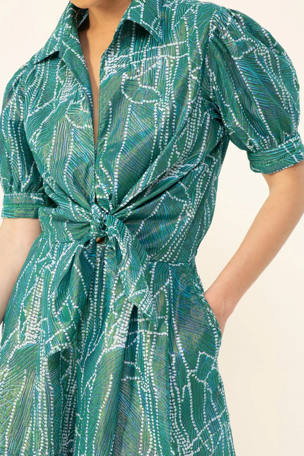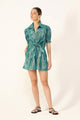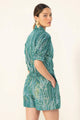 This playful Short Jumpsuit Livia in Green Akoya by Poupette St. Barth combines lustrous cotton metallic fabric with charming details—a classic collar and puff sleeves trimmed in lace, buttoned cuffs, and functional side pockets. Secured with front ties, a hook-and-eye, and zip closure, it's your go-to piece for effortless style with personality.