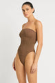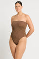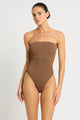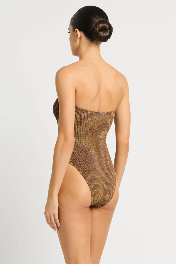 Dive into summer with the Fane One Piece in luscious Cocoa Butter Lurex by Bond-Eye! This versatile strapless swimsuit lets you choose your own adventure—wear it high-cut for a flirty look or low for classic vibes. With its cheeky-to-moderate coverage, it's your perfect beach companion that doubles as a bodysuit when paired with jeans.