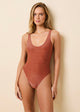 Dive into fun with the Hailey One Piece in Spice by Solid & Striped! This timeless swimsuit shines with shimmering lurex fabric, adding a playful sparkle to your swim days. Its classic scoop neckline, low back, and high-cut legs beautifully elongate your silhouette, making every move feel effortlessly chic and confident. Perfect for those who love a little glam by the water!