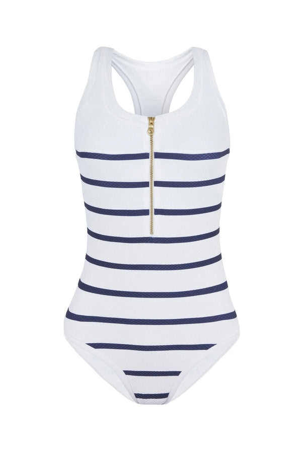 Dive into fun with the Racerback Swimsuit in Nautical Stripe by Heidi Klein—a perfect blend of sporty edge and playful style. Featuring our signature chunky gold zip, this swimsuit adds a splash of shine to your beach look. The hidden shelf-bra offers comfortable support, while the sleek silhouette keeps you feeling confident and ready for any adventure. Sail through summer in style!