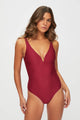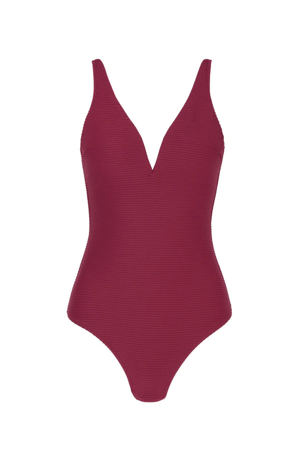 Dive into summer with the V-Cut Swimsuit Cassis by Heidi Klein! This crimson red stunner features a flirty V-neckline that flatters every figure. The ribbed recycled fabric hugs in all the right places, while adjustable back straps let you customize your fit. With medium coverage and heat-resistant gold hardware, this swimsuit is ready for poolside fun or beachside adventures!