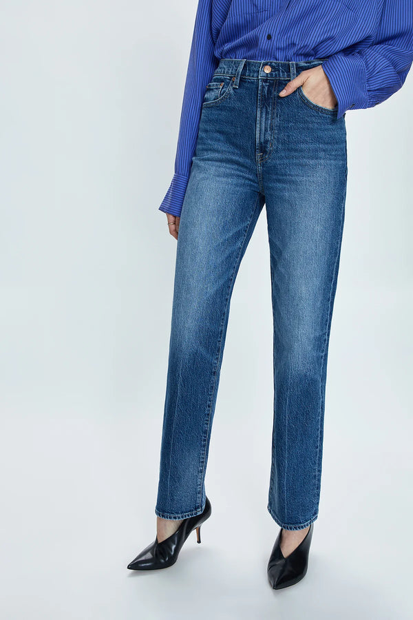 Be in your element with Cassie Super High Rise Straight by Pistola. This pair features a flattering super high waist, classic straight leg fit, and signature comfort stretch denim for all-day comfort. The dark indigo wash with subtle fading and whiskering adds a touch of complexity to your look. Get ready to rock this versatile and trendy style in color Palladium!