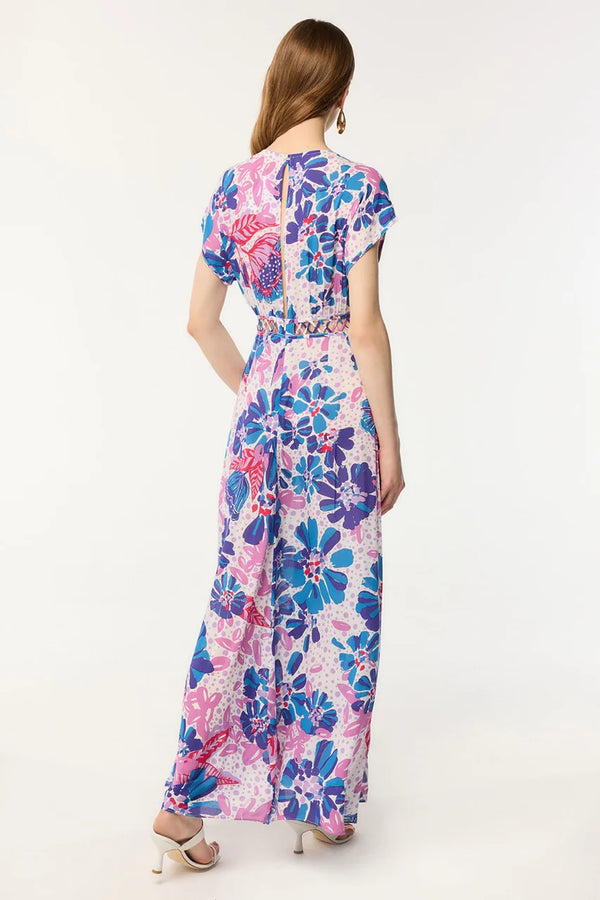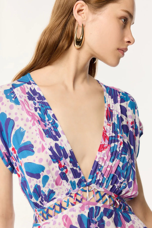 Be the center of attention in this Poupette St Barth Long Dress Cecile, featuring an open waistband and crossed fabric bands for a trendy touch. The pleated neckline and open slit back add a touch of elegance, while the discreet zipper makes it easy to wear. Available in Blue Artistic Flower.