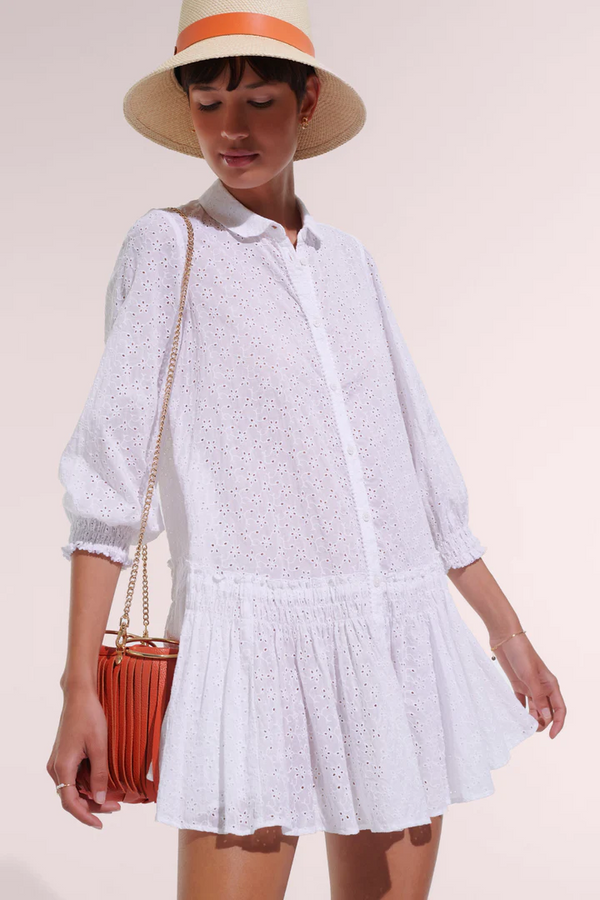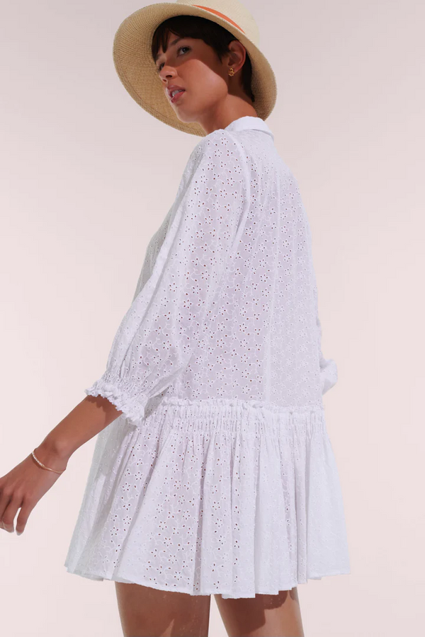 The Mini Dress Tesorino in Optic White by Poupette St. Barth features beautiful eyelet style embroidery, a drop waist, elbow length elastic sleeves and a petite rounded collar. Front buttons add versatility to this handmade sophisticated style.