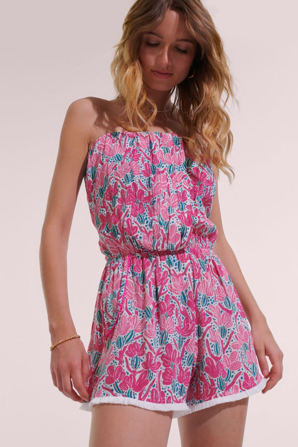 The Ambra by Poupette St Barth is a pleated short jumpsuit that is sure to charm on your next beach vacation. This strapless style features a slim waistband and delicate fringe detailing on the shorts. Offered in Pink Queen Liberty.
