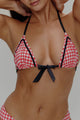 The Coastal Micro Triangle Bikini Top in Cherry Picnic by Frankies Bikinis is your new go-to for soaking up the sun with minimal tan lines. Its tiny triangle shape offers just the right amount of coverage, while adjustable string ties ensure a perfect, comfy fit. Featuring a fresh red gingham pattern with chic black trim and a flirty front tie, this top brings playful charm to your beach days.