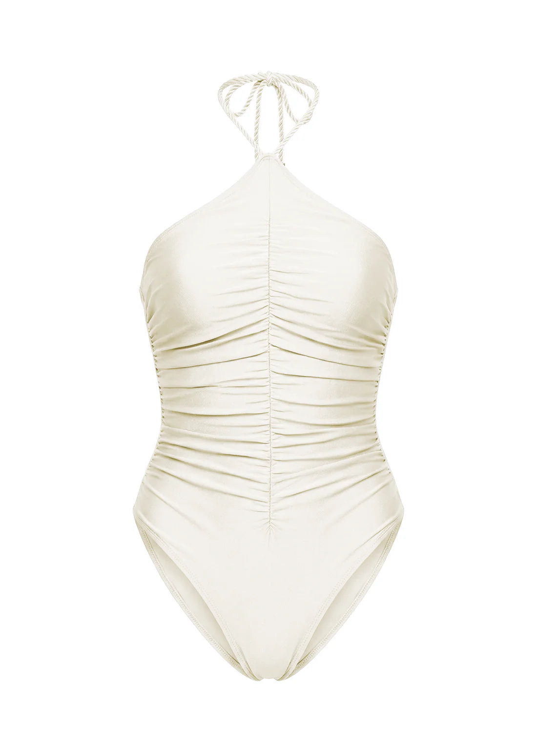 The Mina Halter One Piece in Lustre Brule by Solid & Striped is designed to make you feel confident and beautiful. The halter neckline provides secure support while the strategic center ruching flatters your figure. High-cut hips create a lengthening effect for a polished silhouette. Made from a luxurious lustre fabric, this one-piece swimsuit combines comfort with timeless style for all your poolside moments.