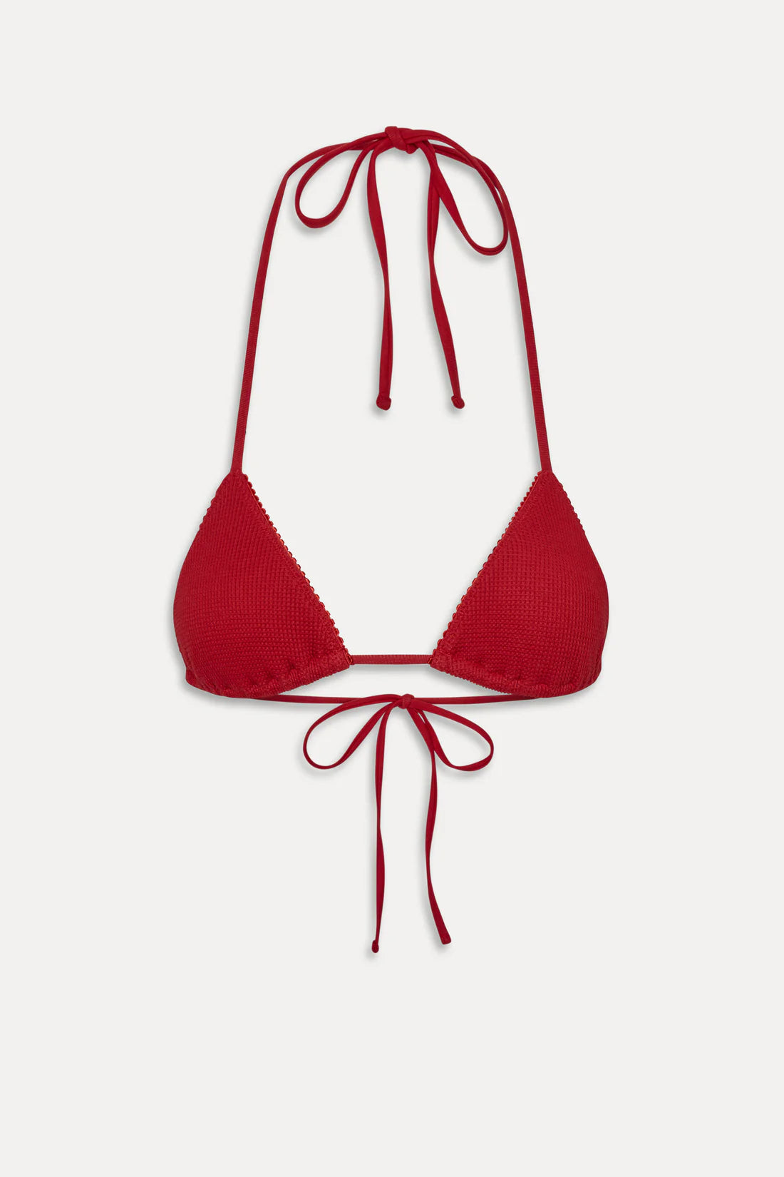 The Nick Triangle Halter Bikini Top by Frankies Bikinis combines romantic style with practical comfort. Crafted from innovative thermal swim fabric, this top keeps you feeling great in and out of the water. Adjustable string ties at the neck and back let you customize the fit to suit your body perfectly. Whether you're lounging poolside or taking a dip, this strawberry red halter delivers effortless elegance.