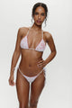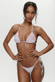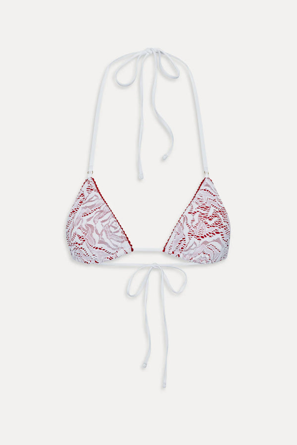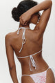 The Nick Triangle Halter Bikini Top by Frankies Bikinis brings romance to your beach days with its delicate custom floral lace layered over swim fabric. Adjustable string ties at the neck and back let you customize the fit to your body, while ruched accents add subtle dimension. The skimpy triangle coverage offers minimal tan lines, and the lightweight design packs easily into any beach bag. Perfect for soaking up the sun whenever the moment strikes.