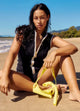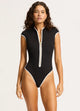 Beach Bound Cap Sleeve Zip Front One Piece Black