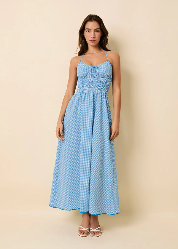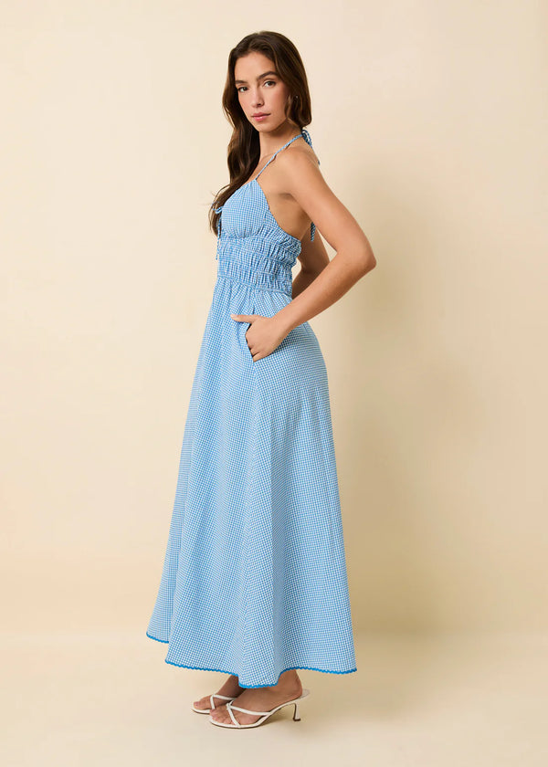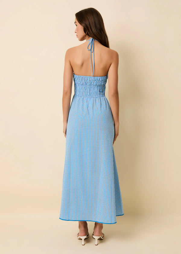 Meet your new warm-weather favorite: the Lolita Dress in Cosmic Blue by Solid & Striped. This charming piece features a fully smocked bodice with separated woven cups that move with you, delivering a flattering fit that actually feels comfortable. Adjust the halter tie to customize your cup placement, tie the delicate front bow just how you like it, and slip your essentials into the hidden front pockets. It's the playful, practical dress that makes you feel effortlessly put-together, whether you're heading to the beach or a backyard gathering.