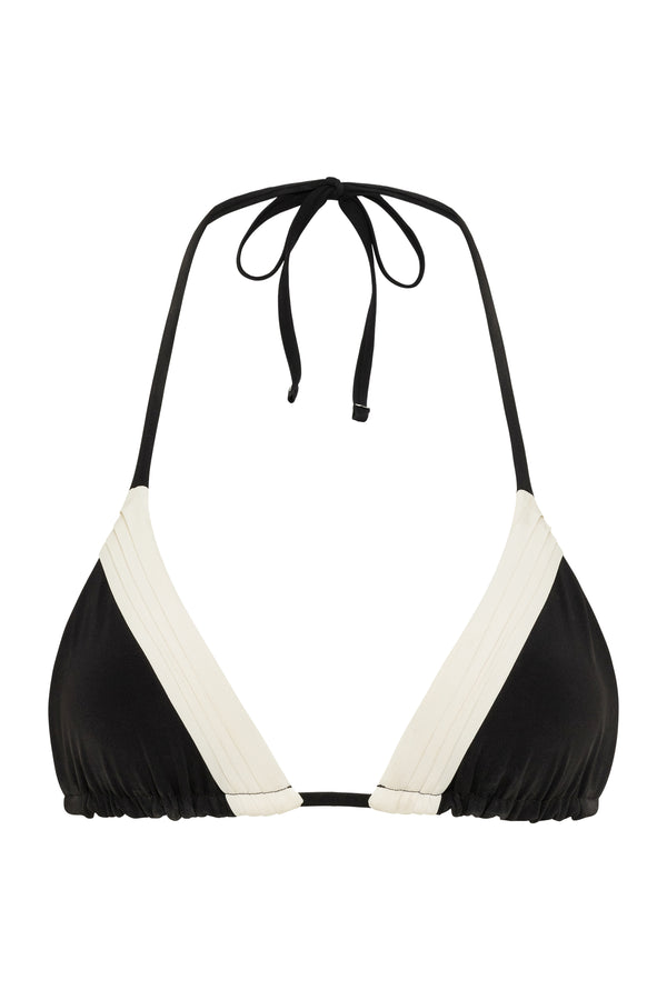 Enjoy beach days in style with the Maia Top by Ophelia Love. Our pleated triangle bikini top features a black and cream color contrast for a playful look. The supportive design includes removable pads and adjustable ties for a perfect fit. Designed on the beaches of 30A and made in Colombia.