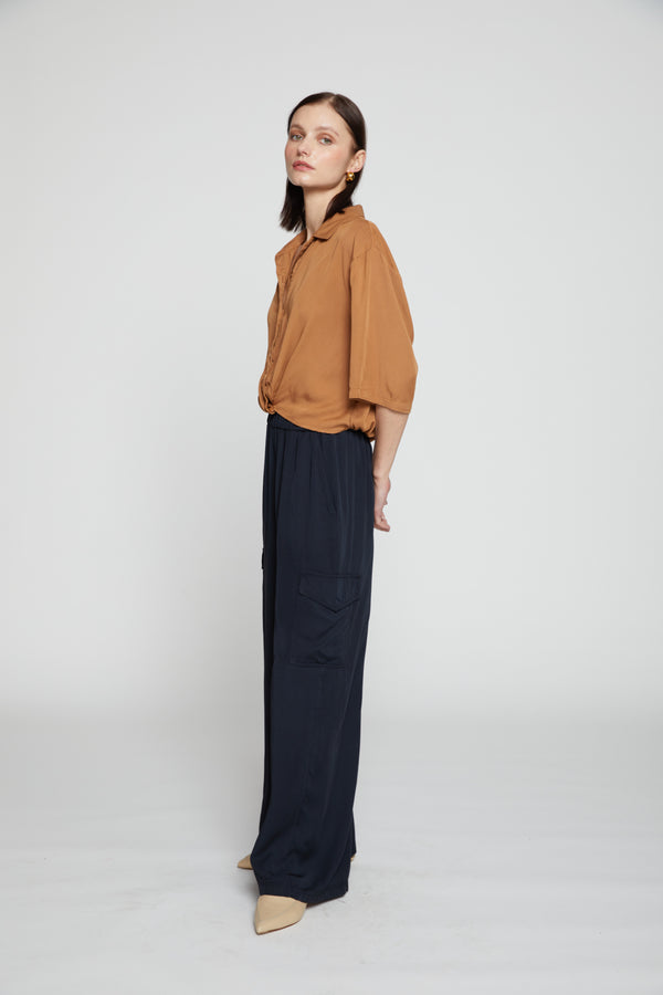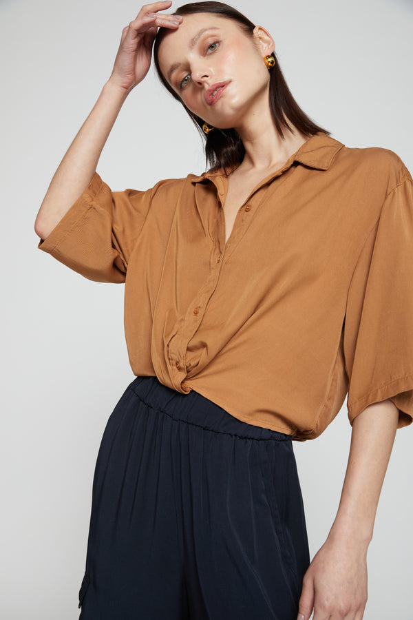 Introducing the Dove Modal Cropped Twist Shirt by Stateside! Get ready to twist and button up in style with this playful short sleeve shirt. Perfect for a fun, casual look. Available in delicious Toffee color.
