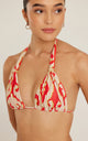 The Adjustable Halter Bikini top by Brazilian swimwear designer Lenny Niemeyer. This triangle bikini top features removable pads and sliding fabric loops that can be adjusted for more or less coverage. A flattering halter bikini style that ties around the neck and back. Made from soft buttery fabric that is biodegradable and offers SPF 50+ protection. Offered in the Turquia print.