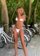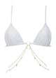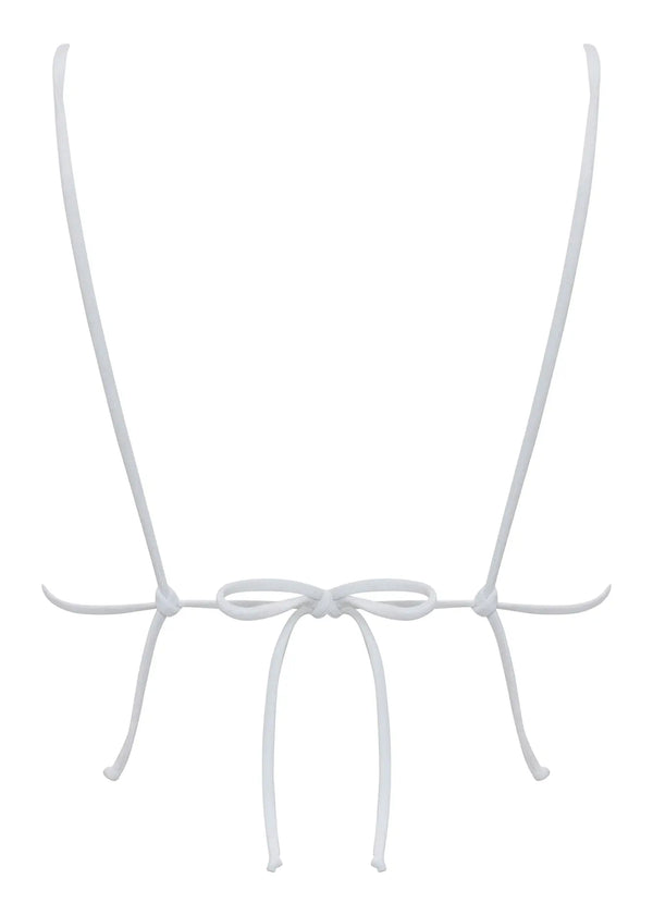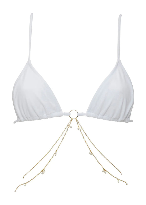 Unleash your inner beach goddess with the Chain Top in White by Bananhot. This unpadded bikini top puts a fun twist on the classic triangle style, featuring gold ring detailing and a waterproof gold chain with beaded pearl design. Get ready to make waves in style!